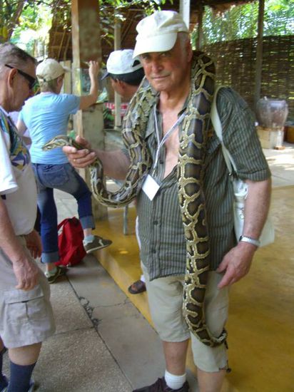 Und wer denkt an Tierschutz, wenn die Riesenschlange mehrmals täglich von ihrem viel zu engen Käfig heraus darf, um den Hals westlicher Touristen zu schmücken? Moment, ich will auch ein Foto machen. Danke. Der Schlangenbändiger bekommt Trinkgeld, zumindest fordert er nicht. Die Schlange würde ihr Futter auch in Freiheit finden, aber wen kümmert's? Es ist ein Arbeitsplatz, und die Alternative wäre eine riesige Flasche, in die das Tier in Schnaps eingelegt wäre, oder sie würde zu köstlichen Gerichten verarbeitet. Ob man die Krokodile auch gegessen hat, bevor ihr Leder zu Handtaschen und Geldtaschen wurde?