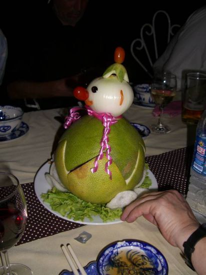 Einige Male Rätselraten, was die eine oder andere Speise sein könnte, jedenfalls ist es immer bunt, zu lustigen Figuren geschnitzt und nicht immer erkennbar, ob es Dekoration ist oder schon der nächste Gang.