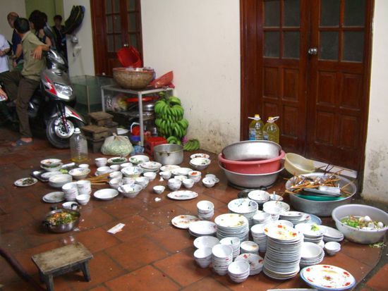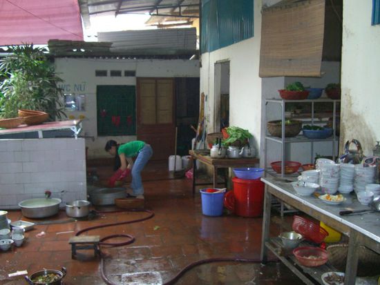 Auf der Fahrt nach Halong hatte ich in einem Landgasthaus Gelegenheit, vietnamesischen Wodka zu kaufen. Ich sah zwar später, dass ich das Dreifache gezahlt hatte, aber da ging's um Geld oder Leben. Die Lokalität sah nicht gerade klinisch sauber aus, und wir versuchten Besteck und Teller vor Gebrauch zu reinigen. Es waren auch alle recht rasch davon überzeugt, dass man besser aus der Flasche als aus einem Glas trank. Geschmeckt hat es trotzdem köstlich, aber vielleicht, weil wir erst NACH dem Essen einen Blick in die Küche werfen konnten. Auf dem Weg zu den Latrinen kam man beim Geschirrspüler vorbei. War ca. 1,50 Meter hoch und hatte zwei Arme und zwei Beine.