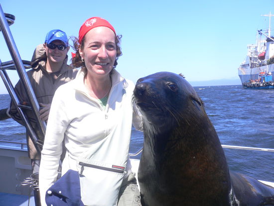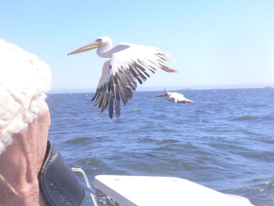 Walvis Bay ist der einzige internationale Seehafen Namibias. Direkt neben dem Hafen startet unser Abenteuer auf dem Wasser. Kurz nachdem alle Gäste das Boot bestiegen haben, kommt ein Seehund angeschwommen und ist mit einem Satz auf das Bootsdeck gesprungen. Er weiss, dass er wenn er brav ist, sich hier sein Mittagessen verdienen kann. Streichelzoo auf dem Bootsdeck für diejenigen, die sich an das große Tier herantrauen. Nachdem wir abgelegt haben steht die Pelikanfütterung auf dem Programm. Angelockt vom in die Luft gehaltenen Fisch und den Lockrufen unseres Kapitäns erheben sich die Pelikane etwas schwerfällig aus dem Wasser. Nach ein Paar Flügelschlägen gleiten sie elegant in Richtung Boot und holen sich ihren Fisch. Was für eine enorme Spannweite so ein Pelikan doch hat!