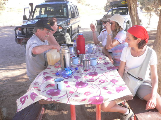 Zuerst die Düne hoch, dann Dead Vlei, um dann unter Bäumen schön im Schatten zu frühstücken. War alles mit gebracht worden. Vom Kaffee, Tee, Orangensaft, Wasser bis hin zu Wurst, Käse, Obst, Brötchen, Brot. An alles hatten sie gedacht.