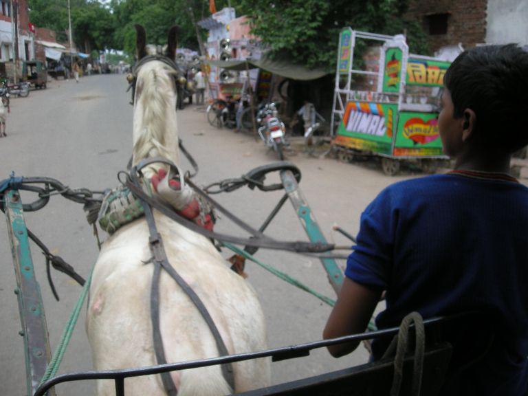 Nahmen unsere Rucksaecke mit und liesen uns von einer Pferderiksha zur Haltestelle richtung Jaipur bringen.