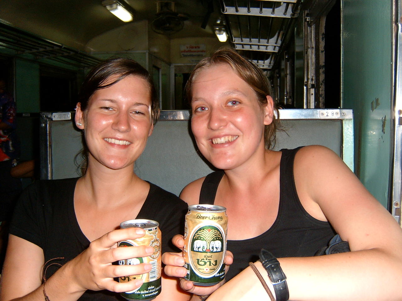 Nach 15 stuendiger Zugfahrt (mal wieder in der Holzklasse, ihr wisst ja, wir sind geizig!) hatten wirs endlich bis nach Chiang Mai geschafft. Die Zugfahrt war der blanke Horror, aber trotzdem irgendwie richtig lustig. Gleich zu Beginn mussten wir feststellen, dass wir zwei uns auf eine mega kleine Bank quetschen wuerden muessen (das Ding waere in Deutschland ein Einzelsitz gewesen, darauf koennen normale Menschen nicht schlafen!) und direkt war klar, dass auf den Schock erstmal ein Bier her musste Wie sich herausstellte, waren wir jedoch nicht alleine, denn neben uns sassen noch zwei Italiener, die ebenfalls zu geizig waren und somit zusammen mit uns leiden mussten! Wie sich zu Sarahs Entsetzen jedoch schnell herausstellen sollte, war es Anne gelungen innerhalb von kuerzester Zeit in Tiefschlaf zu fallen- Sarah hat es auf ganze zwei Stunden Schlaf gebracht, nicht zuletzt deshalb, weil Andrea (einer der Italiener) sie die halbe Nacht zuquatschte.
