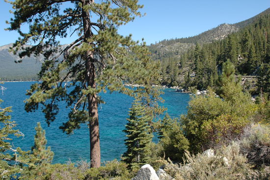 Wir fuhren anschließend das Ufer an der Ostseite des Sees nach Norden. Die Sonne stand im Westen und wir hatten einen wunderschönen Blick auf den tiefblauen See. Leider gab es nur sehr wenig Parkmöglichkeiten, um mal kurz anzuhalten und ein Photo zu schießen. Erst kurz vor Incline Village war ein Aussichtspunkt. Die Parkzeit war auf 20 Minuten beschränkt. Wir kletterten das Ufer hinab, um ein paar Photos zu schießen.