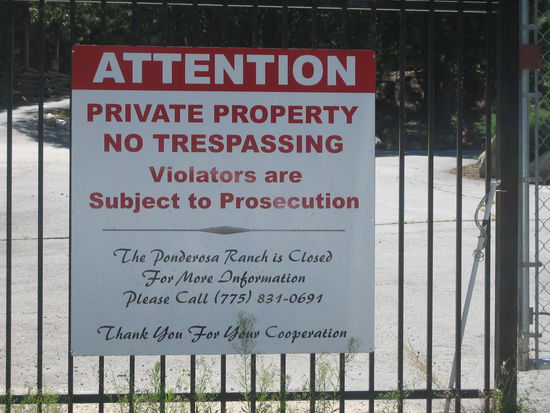In Incline Village machten wir uns auf die Suche nach der Ponderosa Ranch. Ich wusste, dass es am Ortsanfang links eine Straße hineinging. Ich bemerkte eine braune Hinweistafel auf der linken Seite. Wenn der Reiseführer recht hatte, dann muss wohl die Schrift abgemacht worden sein. Nur die Tafel ließ man stehen. Wir wendeten und fuhren neben die Tafel. Tatsächlich konnte man die Konterfeis der Helden (Ben, Little Joe, Adam und Hoss Cartwright) noch schemenhaft erkennen. Und auch irgend etwas mit "Ranch" muss auf der Tafel gestanden haben. Wir fuhren also die Straße hinein und nach wenigen Metern lasen wir ein Schild, auf dem stand, dass die Ponderosa Ranch in Privatbesitz ist und sie nicht mehr zu besichtigen ist. Schade.