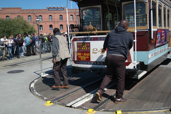 Wir beschlossen, für eine kurze Ruhepause unser Hotel aufzusuchen und fuhren mit der Heyde Str. Cabel car bis zu Broadway zurück. Cable car fahren machte uns immer mehr Spaß und so nahmen wir auch eine kleine Wartezeit an dem Endpunkt in Kauf, zumal die Wartezeit durch einen Straßenmusiker verkürzt wurde und an dem Endhaltepunkt die Cars von Hand auf einer Plattform umgedreht wurden.