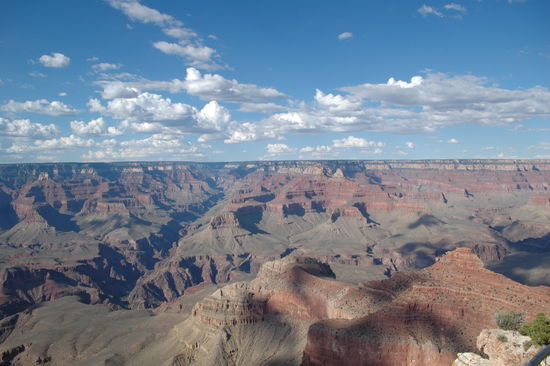Bereits um 5:30 Uhr wurden wir wach. Nachdem wir das Auto vollgetankt haben (die nehmen sogar unsere Euroscheckkarte hier) und einem ausgiebigen Frühstück in Lake Havasu City, machten wir noch ein Bild von der Londonbridge. Die Brücke soll Stein für Stein in London ab- und hier wieder aufgebaut worden sein. Danach machten wir uns auf der #95 auf den Weg nach Norden. Die I 40 verließen wir kurz vor Kingman, um auf der alten Route 66 zu fahren. Bei Seligman machten wir den obligatorischen Halt, um ein paar Fotos zu schießen. Wir fuhren bis Ash Fork und dort wieder auf die I 40 nach Williams. Da in der Hauptreisezeit die Hotelzimmer am Grand Canyon häufig belegt sein sollen, gingen wir kein Risiko ein und machten uns am frühen Nachmittag in Williams auf die Suche. Schon die erste Anfrage im Days Inn war erfolgreich. Wir bezogen das Zimmer. Hier klappte auch zum ersten Mal der Internetanschluss. Um 15:00 Uhr fuhren wir die 56 Meilen bis zum Grand Canyon. Der Ranger am Eingang wollte wissen, ob es unser erster Besuch sei und fragte uns, woher wir kämen. Als wir uns als Deutsche zu erkennen gaben, gab er uns das Informationsmaterial in unserer Sprache und sagte ein paar Worte auf deutsch. Wir parkten direkt am Mather Point und gingen erst mal zum Visitorcenter. Als wir den Grand Canyon sahen, verschlug es uns den Atem. Wir haben schon oft von der beeindruckenden Größe gehört und gelesen, aber wenn man selbst am Rande des Abgrundes steht, kommt man aus dem Staunen nicht mehr heraus. Und der Canyon verändert sich von Minute zu Minute durch den Stand der Sonne und den Schattenwurf der Wolken.