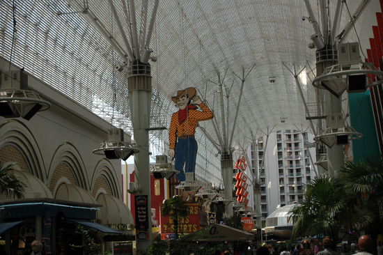 Da uns der Tag zuvor mit der ungewohnten Hitze geschafft hat, standen wir spät auf. Ich besorgte Monika ein Frühstück von Starbucks und brachte es ihr auf das Hotelzimmer. Etwa um 11:00 Uhr verließen wir das Hotel. Diesmal wollten wir wegen der Hitze nicht mehr so viel laufen. Wir kauften uns ein Tagesticket für jeweils 5 Dollar. Zuerst wollten wir das ältere Las Vegas besichtigen. Wir fuhren Downtown zur Fremont Street. Für die etwa sechs Kilometer brauchte der Bus über eine Stunde! Der Bus fuhr jedes Hotel am Strip an und wir sind wohl in die Rush Hour geraten. An der Fremont Street besichtigten wir das ursprüngliche Las Vegas. Hier ist auch der Cowboy, welcher lange Zeit der Stadt als Wahrzeichen diente.