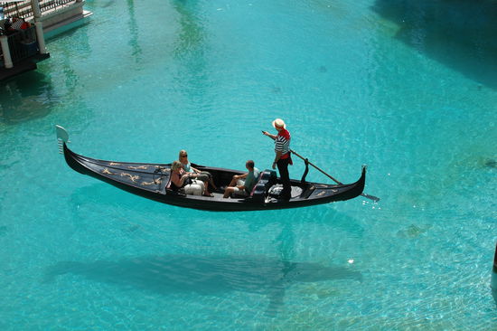 Wir stiegen am Mirage aus und gingen auf die gegenüberliegende Straßenseite zum Venetian. Dies ist das neuste Hotel und wohl auch eines der größten in der Stadt. Viele Sehenswürdigkeiten von Venedig wurden hier im verkleinerten Maßstab nachgebaut. Selbst ein Kanal mit Gondeln wurde nachgebaut. Auch die Hitze passte zu dem Bild von Venedig. Irgendwo sahen wir ein Thermometer und wenn wir richtig gerechnet haben, zeigte es rund 45 Grad Celsius an. Als ich mit Monika vor drei Jahren in Venedig war, hatte es dort auch rund 45 Grad Celsius. Nachdem wir das Gebäude von außen besichtigt hatten, gingen wir in das gut klimatisierte Gebäude. Innen haben sie einige Ladengeschäft im Stil von Venedig aufgebaut. Auch im Innern ist ein Kanal, auf dem Gondeln fahren.