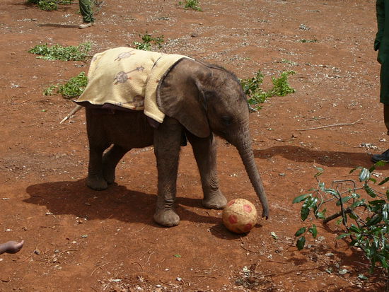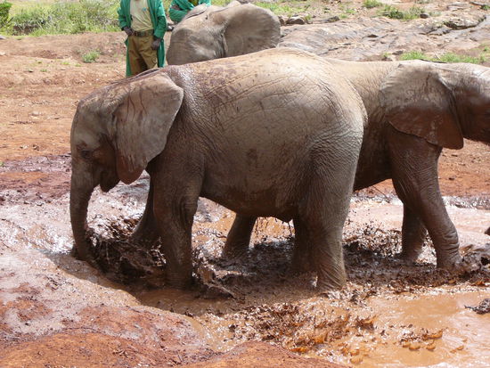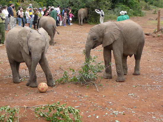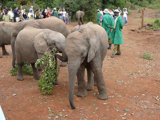 Um 10 Uhr holt ihr Fahrer mich und drei Engländerinnen, die ebenfalls die Vormittagstour gebucht haben, pünktlich vom Hotel ab und wir fahren zunächst zur David Sheldrick Orphanage, einem Waisenhaus und Aufzuchtstation für Elefanten, die allein im Busch angetroffen wurden. Jeden Tag ist von 11 bis 12 Uhr öffentliche Fütterung und heute am Sonntag sind viele Besucher da, neben Touristen auch besonders viele ansässige indische Großfamilien. Für die Kinder ist es wie für mich natürlich auch eine Attraktion, die Elefantenkinder, zunächst die Kleineren bis 6 Monate, dann die Größeren 1 bis 2 Jahre alten beim Schlürfen der Milch aus großen Plastikflaschen, beim Spielen mit Sträuchern, Fußbällen und den Besuchern und beim Baden im Wasserloch zu erleben. Dazu geben kundige Mitarbeiter allerlei Informationen über die einzelnen Elefanten, wie sie heißen, wo man sie aufgefunden hat, wie sie betreut werden und wie man sie später wieder auswildern will.
