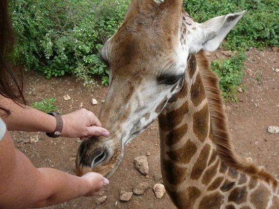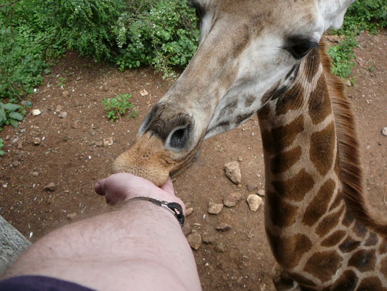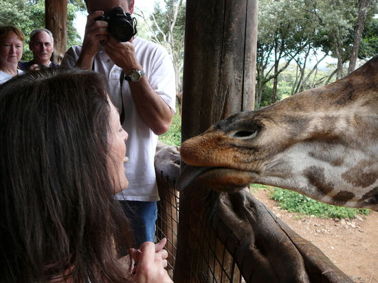 Zweite Station ist der Giraffe Park Langata. Auf einem hölzernen Rundbau stehen die Besucher in Giraffenhalshöhe und mit Giraffenfutter bewaffnet, ein Betreuer gibt seltsame Locklaute von sich, und irgendwann taucht erst eine, dann weitere Giraffen der Marke Rothschild entfernt zwischen den Bäumen auf. Sie bleiben in einiger Entfernung stehen, begutachten welche Typen sie heute wieder abschlabbern müssen, um an ihr Futter zu kommen und denken sich sicher "sind heute ja massig Leute da, muss wohl wieder Sonntag sein".