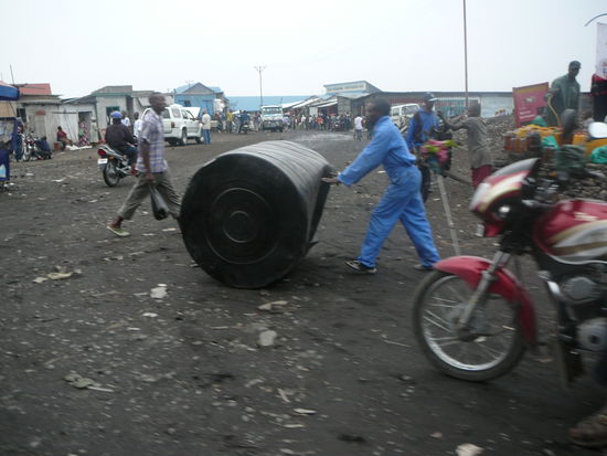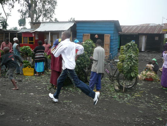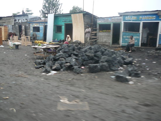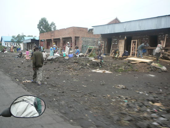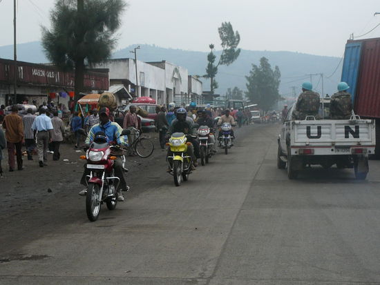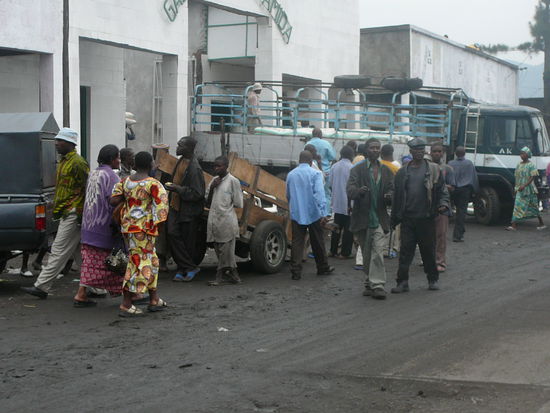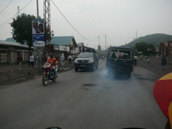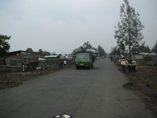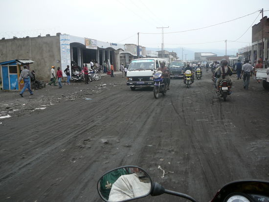 Zweite Überraschung. Die Stadt an sich. Ich nehme mir an der nächsten Kreuzung einen Mopedfahrer, der mich kreuz und quer durch die Stadt fährt und auch eine der Ausfallstraßen raus aus der Stadt, Richtung Nyragongo, der sich heute aber leider in Wolken hüllt. Es ist eine Stadt vom Allerhärtesten, schwarz, voller Lavagestein, armseligster Hütten und dreckiger Märkte, überall Abfall, Gestank. Und voller Menschen, genauso armselige Gestalten. An jeder Ecke Uniformträger der unterschiedlichsten Sorte, aber meist mit Spiegelsonnenbrillen, geladenen Maschinengewehren und finsteren Blicken. Eine Gruppe Soldaten mit MPs belegt eine der wenigen Rasenflächen der Stadt. Dazwischen UN-Fahrzeuge, Pick-Ups mit aufgesetzten Geschützen. Die Ladeflächen von Lastwagen sind voll gestopft mit singenden Menschen. Werden die zu Kundgebungen gekarrt oder ist das der öffentliche Nahverkehr ?