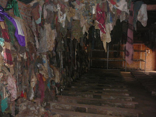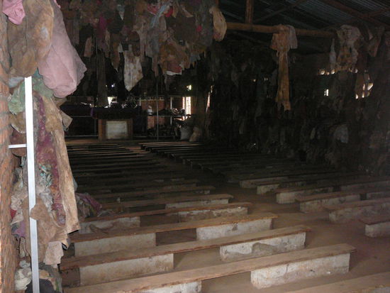 Als ich die Kirche betrete, trifft mich der Schlag. Die Leichen wurden weggeschafft, ein paar Schädel, das scheint wohl unvermeidlich, sind an einer Seite ausgestellt. Ansonsten aber hat man alles so belassen wie es damals nach dem Massaker vorgefunden wurde. Die blutgetränkte Kleidung hängt nun an der Decke und an Wänden und verdüstert den Raum noch mehr.