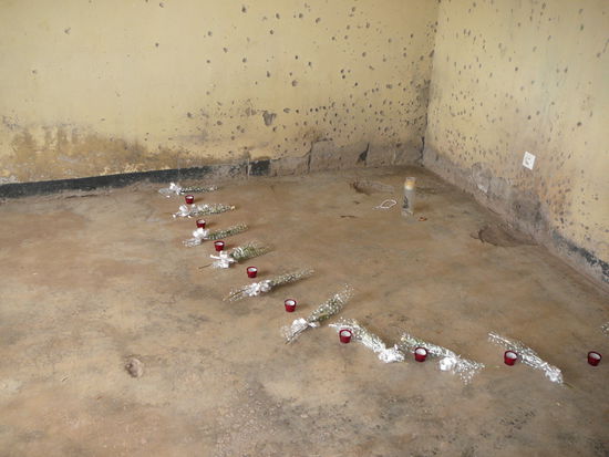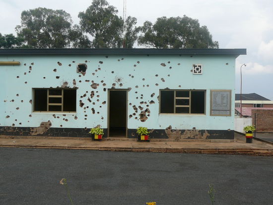 Dass Kigali keine großen Sehenswürdigkeiten hat, ist nicht schlimm. Unser Guide ist sehr nett und kenntnisreich, erzählt viel und man bekommt in kurzer Zeit bei der Fahrt durch die einzelnen Stadtbezirke einen guten Eindruck von der Stadt. So etwas sollte es auch anderswo geben. Es gibt vier Stationen, an denen wir Halt machen. Zunächst die Kaserne der 10 ermodeten belgischen Soldaten. Man sieht noch die Einschüsse der Angreifer, innen die dunklen Flecken an den Wänden, das Blut der Belgier. Und ein Mahnmal.
