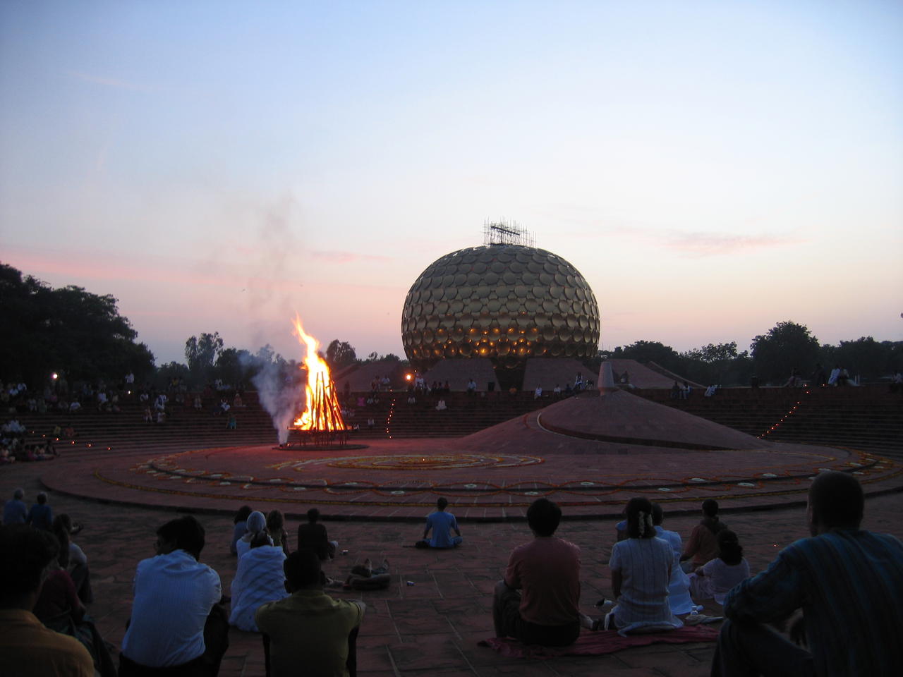Ueber dem Amphittheater thronte das Goldene Matrimandir welches dem ganzen einen etwas spacigen Touch gab. Nachdem alle, manche meditierender, andere schlafender und wir erwartungsvoller Weise platz genommen haben, wurde untem im Amphittheater das Feuer angezuendet und ein Tape mit der Stimme der Auroville Gruenderin (welche 1973 verstorben war) abgespielt worden. Das Band enthielt die Lebensphilosophie der Eurovillians und wirkte auf uns eher etwas belustigend, da wir nur eine altersschwache Stimme kraechzen hoerten.