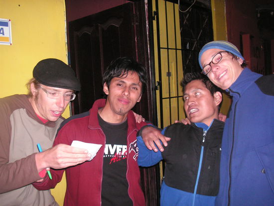 Nun gut erstmal brauchen wir eh noch a bissel Zeit um uns anstaendig zu akklimatiesiern, was wir auch gestern gleich in den hiesigen Tanzlokalen versuchten. Maxi waere nicht der Yoko, wenn er nicht immer einen Lebensplan haette und so ist seine Idee geboren einen Barfuehrer von Huaraz mit den Anfangsworten salutogenese herauszubringen. Natuerlich lernt man bei so einer Akklimatisationstour eine Menge Leute kennen, so koeññen wir am heutigen Tag das peruanische pendon zu Mike Krueger und Thomas Gottschalk, Barkepper Pueblo ("You know Peru is my Country,m my heart...., you know, my my country, my heart" Zitat vom betrunkenem Barchef Puebleo) und den fuersorglichsten Barkeeper (Wir glauben es hat sich noch nie ein Gringo in seine Bar verirrt) Mucho zu unseren Freunden zaehleñ.