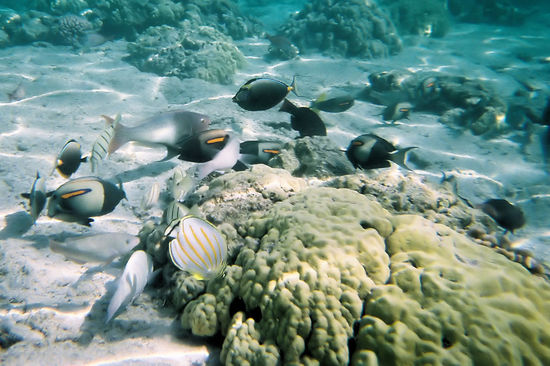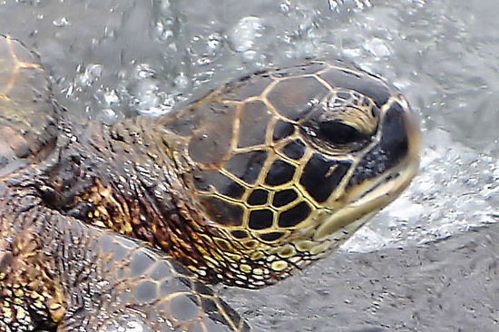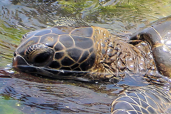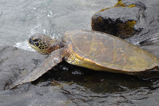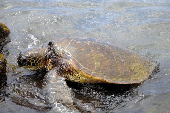 Am nächsten Tag gab es dann ein weiteres völlig unerwartetes Highlight... weil Kirsten den ganzen Nachmittag gegrummelt hatte, dass die Brandung zu hoch zum Schnorcheln gewesen sei, haben wir beschlossen den nächsten Tag zu Snorkel-Beach zu fahren. Davor haben die alten Hawaiianer einen längst auseinander gefallenen Wellenbrecher gebaut, was zur Folge hatte, dass das Wasser dahinter völlig ruhig war. Ich selbst bin ja alles andere als ein Schnorchelfreund. Mit dem Kopf unter Wasser ist für den Menschen einfach keine natürliche Art und Weise der Fortbewegung, aber für meine Frau tue ich ja alles. Also sind wir morgens an die Snorkel-Beach mitten im Ort. Kein besonders schöner Strand, aber... schon zur Begrüßung haben uns 18 Riesenschildkröten entgegengewinkt, die im seichten Wasser Ihre Frühstücksalgen vor sich hin gemampft haben. Völlig unbeeindruckt von den Menschentrauben, die um sie herum Foto-bewaffnet herumstanden. Aber kaum zum Schuss kamen, denn die grüne Meeresschildkröte an sich hebt den Kopf eigentlich nie aus dem Wasser und sieht ohne Glubschaugen eigentlich wie ein ganz gewöhnlicher algenbewachsener Lavafels aus. Deshalb mussten Calvin und Kirsten auch höllisch beim Foto-Shooting Trip aufpassen, nicht dass einer versehentlich auf die Schildkröte draufgetreten wäre. Direkt neben dem Strand war ein kleiner Info-Stand aufgebaut, an dem man sich über die hiesigen Fische und Schildkröten informieren konnte und alle 10 Minuten hat der Life-Guard von seinem Ausguck runtergebrüllt man solle 15 Feet (=5 Meter) Abstand halten. Eine dicke Frau hätte sich beim Flossenanziehen allerdings um ein Haar auf eine Schildkröte draufgesetzt, wenn sie ihr Mann nicht grade noch am Arm gehalten hätte (von sitzen hatte der Life-Guard nix gesagt).