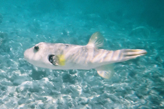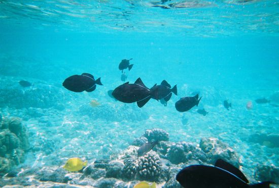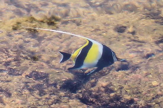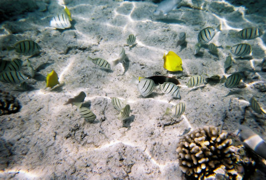 Danach ist Kirsten mit Cedric Schnorcheln gegangen und beide waren restlos begeistert, also musste ich es ja auch machen. Widerwillig hab ich es dann natürlich auch gemacht und es war unglaublich. Gelbe, blaue, grüne, rote, schwarze, neonfarbige und was weiß ich noch alles für farbige Fische sind wie in einem Aquarium um uns herumgeschwommen. Dazu Korallen in grün und blau und türkis. Es war unglaublich. Ich hätte so was nicht für möglich gehalten. Nur Calvin wollte nicht mit einem Schnorchel ins Wasser, was aber kein großes Problem war, da wir einfach von den Felsen von oben ins Wasser schauen und fotografieren konnten. Das war so klar, dass man die Fische genausogut von draußen beobachten konnte. Leider hatten wir keine Unterwasserkamera, also blieb uns nichts anderes übrig, als uns eine (die Kinder bestanden auf zwei) Wegwerf-Unterwasserkameras zu kaufen und irgendwann wiederzukommen. Die werden einem dort fast nachgeworfen. Im Wal-Mart gab es ungefähr 5.000 Stück zu grade mal umgerechnet 6 Euro. Schon erstaunlich wie billig man die Dinger produzieren kann.