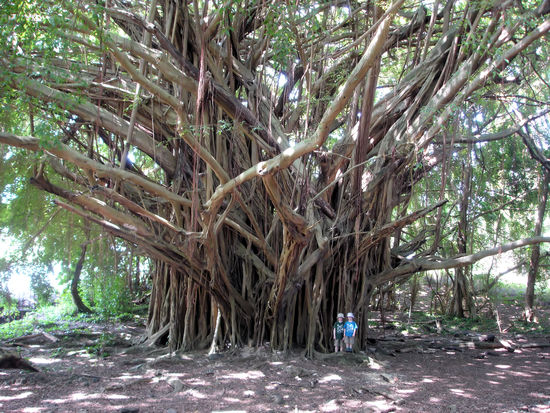 Am nächsten Tag das übliche Bild: Sonne. Also sind wir mit unserem Straßenkreuzer nach Hilo und haben den dortigen noch schöneren Regenwald erkundigt. Da es soviel regnet gibt es natürlich tolle Wasserfälle und unglaubliche Bäume, z.B. einen mit ca 10m Stammdurchmesser wie auf dem Foto zu sehen. War eigentlich nicht ein Stamm, sondern eine Ansammlung von Luftwurzeln um den eigentlichen Stamm. Die Kinder konnten also prima verstecken spielen, während ich immer sorgenvoll nach oben geschaut habe, weil überall Baumstamm-dicke abgebrochene Äste auf dem Boden rumlagen.