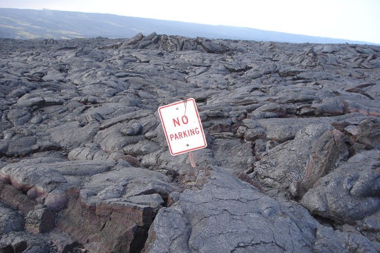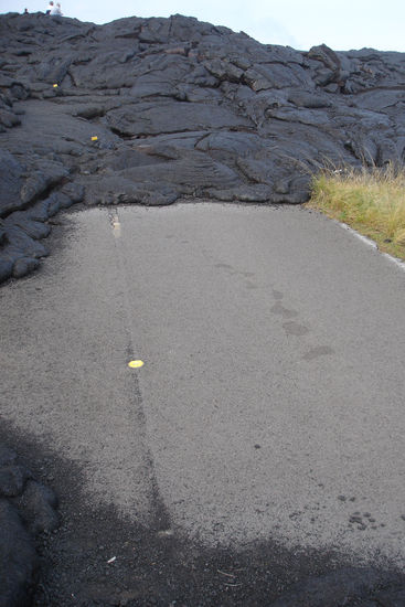 Um 17 Uhr waren wir dann am Ausgangspunkt der Tour unten am Meer und haben uns informiert, ob man flüssige Lava sehen könne. Ja, aber nach 4 Meilen pfadlosem Marsch über Lavawüste. Hin und zurück macht das ungefähr... 8? Also knapp 14 Kilometer, davon die erste Hälfte in der Dämmerung und die zweite Hälfte in stockdunkler Nacht. Der kundige (?) Ranger klärte uns aber darüber auf, dass man nach der Hälfte des Weges einen entfernten, aber recht schönen Blick auf die Lava hätte. Dem Hinweis gingen wir dann im wahrsten Sinne des Wortes nach, zuerst noch auf einem Stück Straße bis zu der Stelle, wo die Lava den Asphalt überrollt hat.