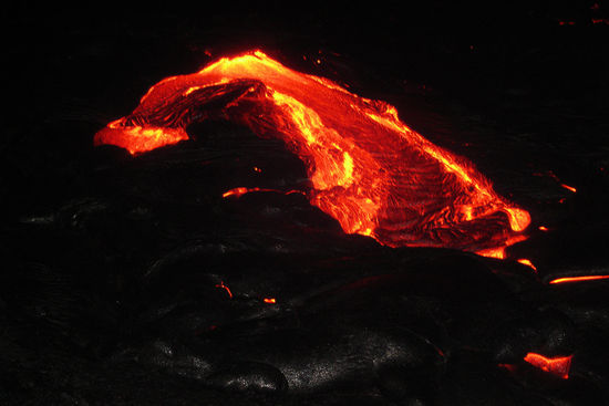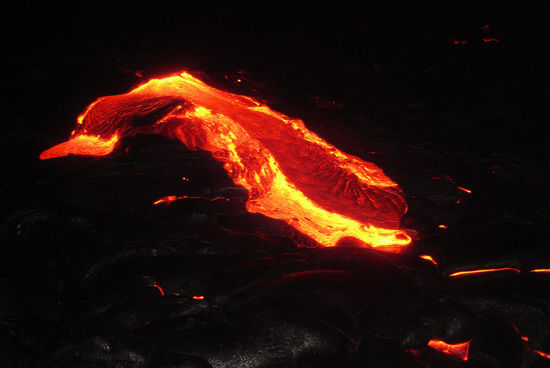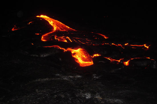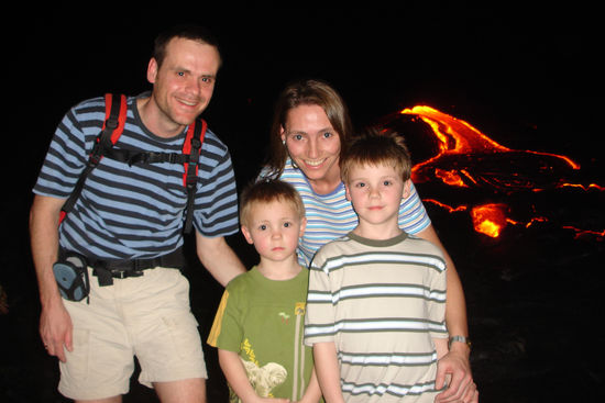 Doch oh weh... nach einer Stunde flottem Fußmarsch, 3 verstauchten Knöcheln pro Person und einigen Schürfwunden durch die messerscharfen Lavakanten waren wir an der besagten Stelle. Vor uns schwarze Lavawüste, hinter uns, links von uns und rechts von uns auch. Toller Tipp. Also weiter, dann eben die ganze Strecke, schließlich sind wir ja profi-expeditionsmäßig ausgerüstet. Feste Wanderschuhe, Erste-Hilfe Päckchen und das wichtigste: 4 LED-Taschenlampen, zwei mit Batterie, zwei zum cranken (gibts dafür auch ein deutsches Wort? Aufladen durch Hebeldrehen?). Zum Glück ist mit uns noch eine andere Gruppe unterwegs und bei der war ein Eingeborener (mehr ein Einheimischer,... was auch immer, es ändert nichts an der vorliegenden Tatsachenschilderung) und zu unserer aller Überraschung sagte der uns, das wir direkt bis an die fließende Lava rankönnen und dieselbe nicht nur aus ein paar hundert Metern Entfernung bewundern könnten... Das hat bei den Kindern zusätzliche Kräfte freigemacht, so dass wir die 4 Meilen / 7 km in 2 Stunden hingeflogen sind.