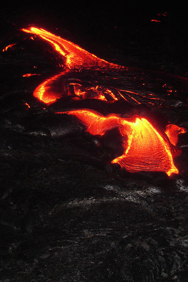 Und dann wurde es mit einem mal wärmer und wärmer und plötzlich waren vor uns lauter gelb und rot leuchtende Risse im Boden. Da floss die Lava unterirdisch zum Meer, so ca 2000 Grad heiß. Und gerade als wir uns ein wenig ausruhten ist keine 3 Meter vor uns ein Lavabrocken langsam in die Höhe gehoben worden und die Lava ist drunter hervorgequollen. Von der Konsistenz ungefähr so wie Honig. Dann ist sie in einem zähen Strom geflossen und hat den Lavabrocken nach und nach aufgelöst, bis nix mehr von ihm übrig war. Währenddessen hat es die ganze Zeit leise geklingelt und geklirrt (ungefähr so wie wenn das Christkind kommt), weil die oberste Lavaschicht beim Erkalten fest wurde und sich gleich drauf zusammengezogen hat und wieder gesprungen ist. Und so ging es die ganze Zeit weiter. War ein Lavastrom versiegt, hat sich 5m weiter der nächste plötzlich aufgetan.