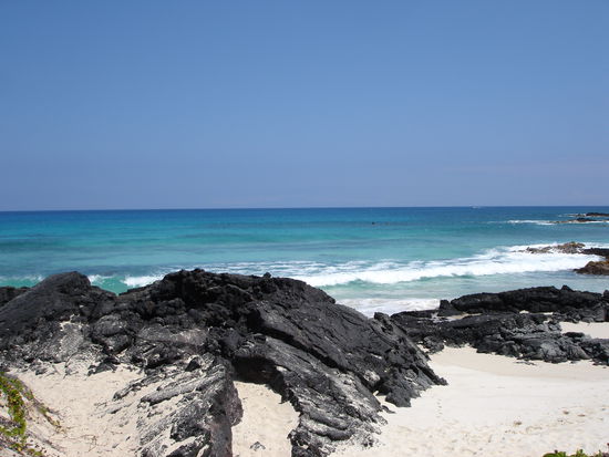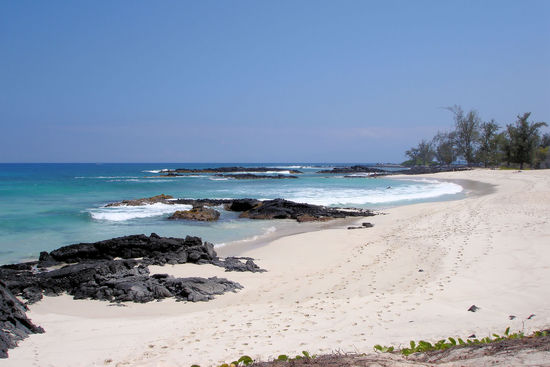 Der nächste Tag war dann der erste richtige Strandtag und aus einem unerfindlichen Grund hatte Kirsten einen Strand rausgesucht, zu dem man nur nach einer 30-minütigen Wanderung über Lava kam, der aber besonders malerisch sein sollte. Wäre er auch gewesen, wenn ich nach 30-minütiger Schlepperei in glühender Hitze noch zu irgendeiner Wahrnehmung fähig gewesen wäre. Im Übermut, hatten wir die halbe Ranch leergeräumt: 4x Flossen, Brillen, Schnorchel, Boogie-Boards usw usw. Gebraucht haben wir davon nur 2 Boogie-Boards, denn die Brandung war viel zu stark zum Schnorcheln. Überhaupt war die Anfahrt bereits ein Abenteuer. Dass die Autoreifen die 2 Meilen Lava-Schotter-Strecke zum Parkplatz überlebt haben, war schon ein Wunder, aber es geht halt nix über amerikanische Wertarbeit in Sachen Auto (naja...). Einmal am Strand angekommen, haben wir uns dann zentimeterdick mit 50er Sonnencreme bedeckt.... schließlich kamen wir direkt aus dem Schnee nach Hawaii und waren Sonne aber auch gar nicht gewöhnt. Außerdem sind haben wir nur mit T-Shirts sonnengebadet. Hat aber alles nicht genutzt, die Waden und Unterarme waren Lobster-rot am Abend. Und da es keine 100er Sonnencreme gab, mussten wir am nächsten Tag eine Strandpause einlegen.