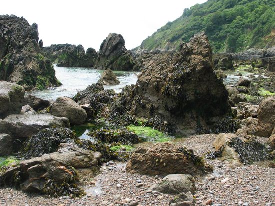 Die erste grandiose Aussicht bot sich in der Saints Bay. Glücklicherweise schien die Sonne und die Bucht lag glitzernd vor uns. Nach weiteren schönen Ausblicken erreichten wir die Moulin Huet Bay. Wegen der Ebbe fanden wir einen breiten Sandstrand vor. Ein Weg und eine Treppe führen direkt in diese spektakuläre Bucht. Dort hielten wir uns längere Zeit auf.