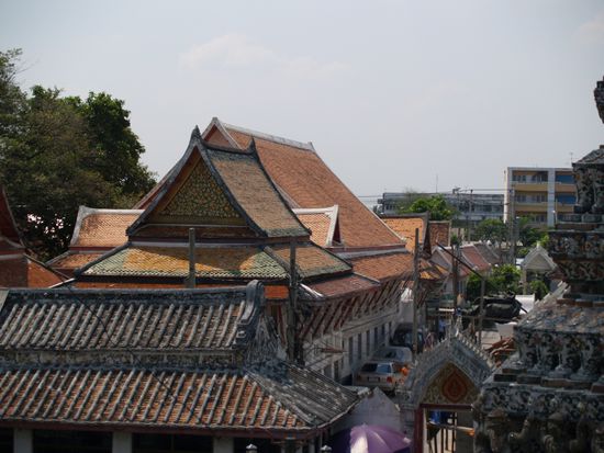 Die Aussicht ist zwar nicht mit dem Baiyoke Sky Tower zu vergleichen, der ist ja auch 309m hoch, aber hier ist man inmitten der Altstadt. Und es kostet keinen Eintritt. Habe den deutschen, ich weiß leider nicht wie er heißt, nur dass er aus Oberhausen kommt und in der folgenden Nacht zurück nach Deutschland geflogen ist, gefragt, ob er auch von einem Tuk Tuk über etliche Schneider hierher kam. Es war bei ihm ähnlich. Aber er hatte sich bei einem Schneider das komplett Programm aufschwätzen lassen. Anzug mit drei Hemden und Krawatten für 450 Euro. Preislich aber eigentlich ok, wenn man bedenkt, dass alles Maßgeschneidert und aus Kaschmir ist. Wieder unten angekommen, sind wir noch ein Stück gemeinsam weitergelaufen, er musste noch zu seinem Schneider zur letzten anprobe. Ich beschloss erstmal wieder in Richtung Hotel zurück zu gehen. Hatte so langsam keine Lust mehr. In der Stadt war es ziemlich drückend, die Luft stand und die Rush Hour setzte ein. Bin trotzdem zu Fuß zurück. Im Tesco Lotus habe ich mir noch eine Flasche Cola gekauft und bin dann ins MBK Center ins Internet. Habe mich bei allen als Lebendig und wohlauf gemeldet und die ersten Stories an die Freunde verteilt. Zurück im Hotel bin ich erstmal in den Pool. Erfrischend war es aber nicht gerade. Das Wasser war nur ein paar grad kühler als die Luft. Hat aber trotzdem gut getan. Es ist jetzt viertel vor 8, werde gleich mal was essen gehen und dann mal schauen, was ich heute Abend noch so mache, mir tun immer noch die Füße von der Lauferei heute weh.