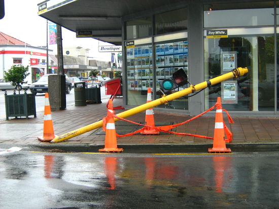 zurueck in Christchurch erwartet uns der Regen, eine umgenietete Ampel und kein Paeckchen...die Fahrt war also fuer die Katz...