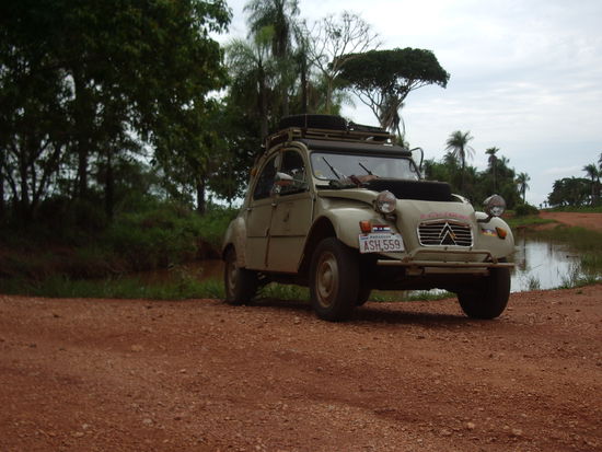Morgens ging es dann, wieder, in die Stadt, der Auspuff wollte noch geschweißt werden und wir unsere, so dachten wir überflüssigen Real`s loswerden. Als der Auspuff dran war, wir darauf "10 Jahre Garantie" bekamen sind wir weiter gefahren Richtung Grenze Paraguay und Rio Apa. Allein der führte Hochwasser, das bekamen wir in den nächsten beiden Tagen noch das eine oder andere mal zu sehen und der Fährmeister hatte wohl beschlossen, die nicht vorhergesehen Pause mit ein paar Bieren im nächsten Dorf zu feiern, auf jeden Fall war er nicht da. Lediglich der brasilianische Grenzposten. Die Jungs, von denen einer einen deutschen Großvater haben wollte...., erboten sich uns für 40Real über den Fluss zu bringen: Mit einem kleinen Boot die Fähre von drüben holen, uns rüberstaken und wir sind drüben. Hörte sich gut an, hatte aber 2 Haken:
