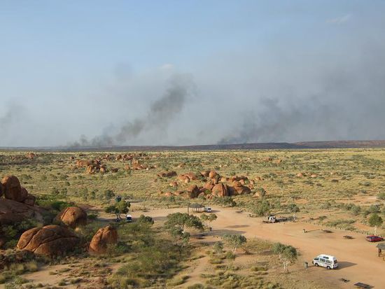 erlebnis #1: devils marbles. mitten in der wueste auf der rechten seite des highways erblickten wir bei rasantem tempo rote murmeln - nur ungefaehr millionenfach vergroessert. simon liess es sich nicht nehmen jeden einzelnen der ca 279 felsen zu besteigen waerend wir anderen damit beschaeftigt waren die fliegen aus unseren nasenloechern herauszulocken - scheint ihr lieblingsplatz zu sein... in der ferne brannten 5-6 kleine buschfeuer und unser unabgesperrtes, schluesselbestecktes auto war auch nach dieser exkursion noch an ort und stelle. wir hatten uns schon mehrere reaktionen ausgemalt, unter anderem auf dem boden rollen und weinen oder auch wilder verzweiflungssex.