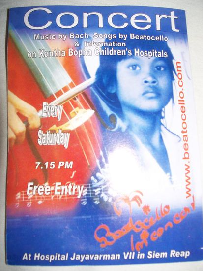 Ein ganz besonderes Erlebnis unseres Siem Reap Aufenthaltes war der Besuch eines Cellokonzertes von dem Schweizer Arzt Dr. Beat Richner (sein Kuenstlername lautet "Beatocello"). Durch einen Flyer wurden wir auf das Konzert aufmerksam. Neben der Musik, wuerde der Arzt zwischendurch von seiner Arbeit in dem kambodschanischen Krankenhaus Kantha Bopha erzaehlen sowie ueber die gesundheitliche Situation der Kinder in Kambodscha informieren. Alles hoerte sich sehr interessant an und wir waren sehr gespannt wie das Konzert werden wuerde. Soviel kann ich schon mal vorwegnehmen. Es war ein tief bewegendes Erlebnis! Der schweizer Arzt begruesste das Publikum mit einem Cellokonzert von Bach. Danach fing er an zu erzaehlen und liess zwischendurch einige kuerzere Filme laufen.
