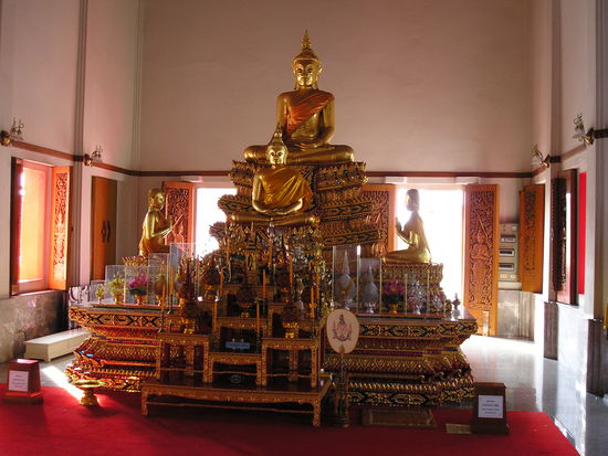 Anschliessend sollte es zum großen Buddha gehen, auf dem Weg dorthin wurden wir von einem Abgesandten des Königshauses, wie sich später rausstellte, angesprochen. Er gab uns viele Tipps zu verschiedenen Sehenswürdigkeiten der Stadt, jetzt hätten wir am liebsten noch 3 Tage länger bleiben wollen. Nach einer halben Stunde hatten wir genug Informationen um den letzten Nachmittag ohne Pause in verschiedenen Tempeln, Museen und Geschäften der Stadt verbringen zu können und wir hatten einen eigenen TukTuk-Fahrer der uns nun überall dorthin fährt. Am Tempel "Wat Thewarat Kunchorn", nur wenige Touristen kommen hier her, haben wir wieder eine nette Begegnung mit einem Thailänder der mittlerweile in New York lebt gehabt, auch er gab viele Tipps und Ratschläge zu einem Bangkok-Besuch.