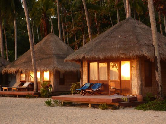 Die aufgehende Sonne in den Fenstern der Bungalows