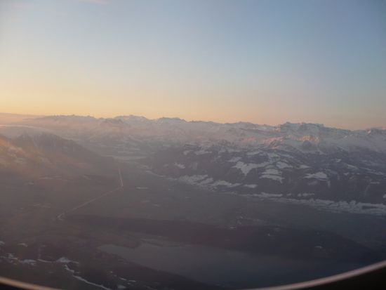 Nach gut zehn Stunden Flug wird es draussen Tag. Wir sind bereits über der Schweiz und sehen die verschneiten Berge in einem herrlichen Sonnenaufgang.