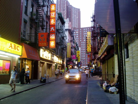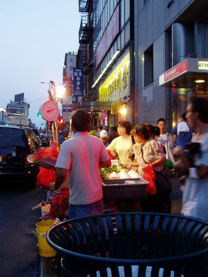 Die Mottstreet,wenn ich mich richtig erinnere,fuehrt von China Town hinein nach Little Italy,was bedeutet,das diese europaeische und die asiatische Kultur sich auf eigenartige Weise mischen,und man zwischen Handtaschenfaelschern(man betritt den Laden,will eine NoName-Tasche erstehen und er Chinese fraegt:"Hai,guys ,would you like to see some Chanel and Gucci bags?"-Man wird daraufhin mit ein paar schnatternden,Schmuck- und Fotoapparat-behaengten Ami-Touris in den Secret Room,der im hinteren Teil des Ladens versteckt ist gefuehrt und darf sich drot aus einer unvorstellbaren Masse von gefaelschten Markenhandtaschen seine It-Bag raussuchen)und asiatischem Gemuesestand ,sowhl "Luigis Pizza Bakery" oder auch "Giovannis Ristorante" mit indischen oder lateinamerikanischem Personal findet.Ueber der Strasse haengen gruen-weiss-rote Glitzergirlanden und die Kellner auf der Strasse versuchen einen mit Komplimenten in ihr MultiKulti-Restaurant zu buksieren.