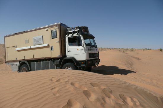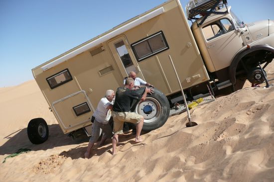 Diese Fahrt wurde zum bisherigen Höhepunkt unserer Reise: Einsame Pisten, Dünen mit einsanden, ausgraben, neuen Strecken suchen, Reifenpanne, Wüstencamps mit Lagerfeuer und Sternenhimmel vom Feinsten. Neben Sandbädern gab es auch ein Bad im Quellteich von Ksar Ghilane, mitten in der Sandwüste.