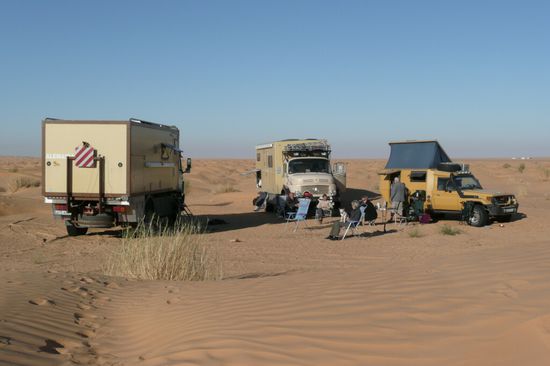 Auf dem CP in Douz haben wir dann zwei weitere deutsche Paare, jeweils auch mit Hund, getroffen, mit denen wir uns auf Anhieb gut verstanden haben: Stefan und Andrea mit Mercedes-Rundhauber-Womo und Peter und Rotraut mit Tojota-Womo. Also haben wir uns zusammen getan, um gemeinsam die Wüstenpiste von Douz nach Ksar Gihlane, einschliesslich eines Abstechers rund um den Wüsten-Nationalpark Jebil und zum Jebel Tembain einem markanten Tafelberg in der Wüste, zu fahren.