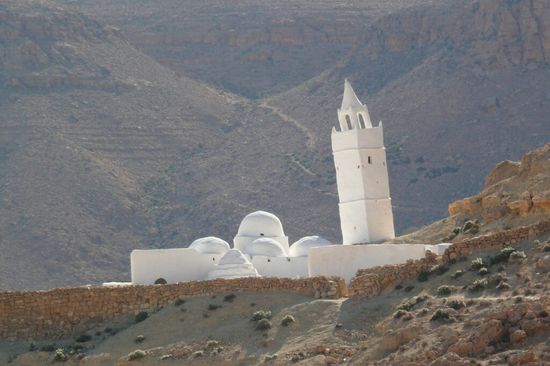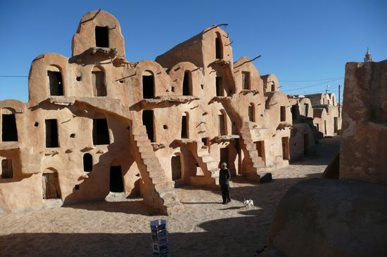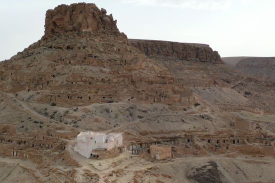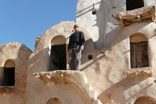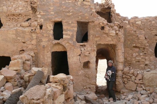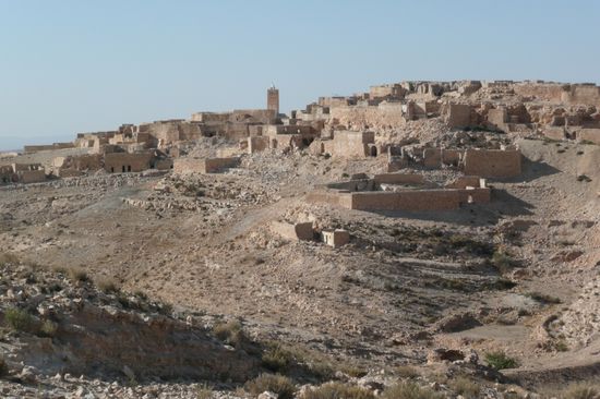 Nach sechs gemeinsamen Tagen mussten wir uns leider trennen, da wir unseren Termin Ende November an der Libyschen Grenze hatten und die anderen ihren Urlaub bis Ende Dezember in Tunesien verbringen wollten. Also machten wir uns gegen Osten auf und besichtigten noch die herrliche Bergwelt von Matmata und Tataouine mit ihren Beberdörfern (Ksour), Speicherburgen (Ghorfas) und Hölenwohnungen. Die meisten davon sind zu Gunsten moderner Häuser und Dörfer verlassen. Einige davon haben wir auf Pisten abseits der allgemeinen Touristenpfade besucht und konnten unbehelligt in den alten Gemäuern herumstöbern: