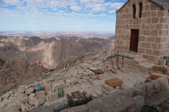 ging es auf steilen Wegen und Treppen auf fast 2300m. Jetzt kurz vor Weihnachten waren die Temperaturen erträglich. Schon auf dem Weg zeigte sich die volle Schönheit der Sinaiberge, aber der Rundumblick auf dem Gipfel war dann einmalig. Die Sicht ging bis weit über das Rote Meer nach Saudi Arabien und bis nach Israel hinein. Ein wirklich würdiger Berg für die Überreichung der Zehn Gebote. Man spürt die Ausstrahlung dieses besondern Ortes vor allem auch, da wir alleine auf dem Gipfel waren, da die Pauschaltouristen zum Mittagessen wider im Hotel sein mussten.