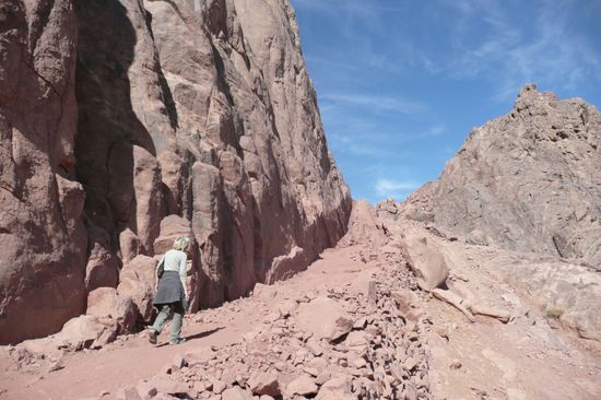 Am folgenden Tag fuhren wir weiter durch das malerische und später wilde Wadi Feiran zum Katharinenkloster am Gebel Sinai (Moses-Berg). Zunächst waren wir vom Kloster etwas enttäuscht, da es am Abend im Schatten lag und dadurch sehr unscheinbar wirkte. Am nächsten Morgen brachen wir auf, um den Mosesberg per Pedes zu erklimmen. Jetzt im Morgenlicht entfaltete das Kloster auch seine besondere Stimmung, die sich auch auf uns übertrug. Nach kurzer Besichtigung (der "brennende" Dornenbusch steht da wirklich),