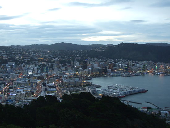 Anschliessend sind wir dann eine Weile durch die Cuba Street gelaufen und haben uns vom Lonely Planet erst in ein leckeres Cafe und danach in ein (natuerlich preisguenstiges) Fischrestaurant leiten lassen. Dieses Fest massloser Voellerei hat uns dann dazu veranlasst, abends noch auf den Mt. Victoria hinaufzulaufen, von dem man die beste Aussicht ueber Wellington hat.