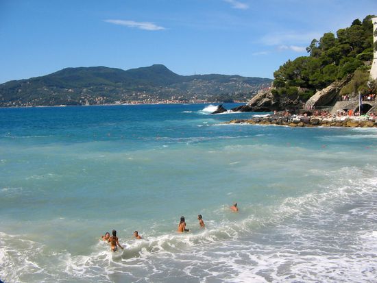 Um 10.30 Uhr ging es dann los, erst nach Rapallo in die Innenstadt und dann der Küstenstraße folgend nach Zoagli. Durch das raue Wetter der letzten 36 Stunden war auch das Meer entsprechend aufgebraust, so dass die Wellen in Zoagli nun ordentlich gegen die Brandung dreschten.