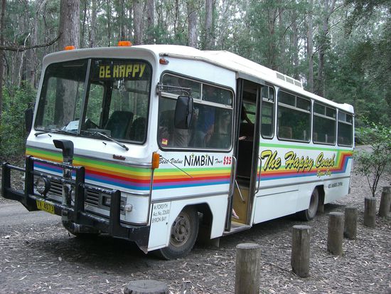 Da wir von vielen gehoert haben, dass wir nach Nimbin, einem kleinen Hippie-Dorf eine Stunde entfernt von Byron Bay, muessten, fuhren wir mit dem "Happy Coach" Bus fuer 25 $ nach Nimbin.
