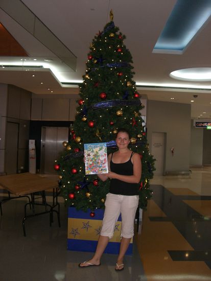 Viel Aufwand fuer das Foto mit unsren Adventskalender (mussten nachdem uns eine Security Dame darauf hingewiesen hat, dass man von dem Baum und vom Einkaufszentrum innen keine Bilder machen darf, weil sonst andre Laender wissen, was sie verkaufen, erstmal zum Office gehen und nach Erlaubnis fragen)