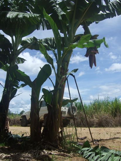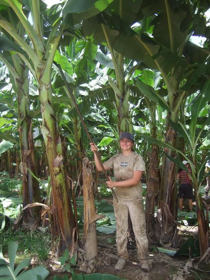 Freitags angekommen, Montag angefangen mit Arbeit. Diesmal auf einer Bananenfarm, die ersten paar Tage Sortieren im Schatten, waehrend ab und zu mal ne Riesenkakalake einen bekrabelt hat, danach dann bei meistens 25 bis 33 Grad bei Sonne und Regen draussen auf dem Feld gestanden und mit nem verlaengertem Messer/Sense die ueberfluessigen Blaetter abgeschnitten.