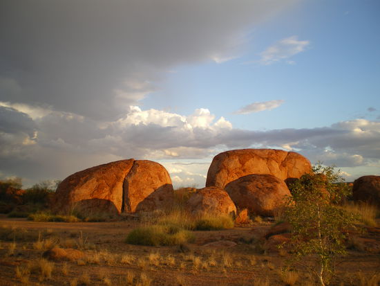 Devils Marbles - Riesige, runde Steine mitten in der Pampa. Sehr beeindruckend, vor allem wenn die Sonne untergeht. Gerade rechtzeitig sind wir mal wieder angekommen.