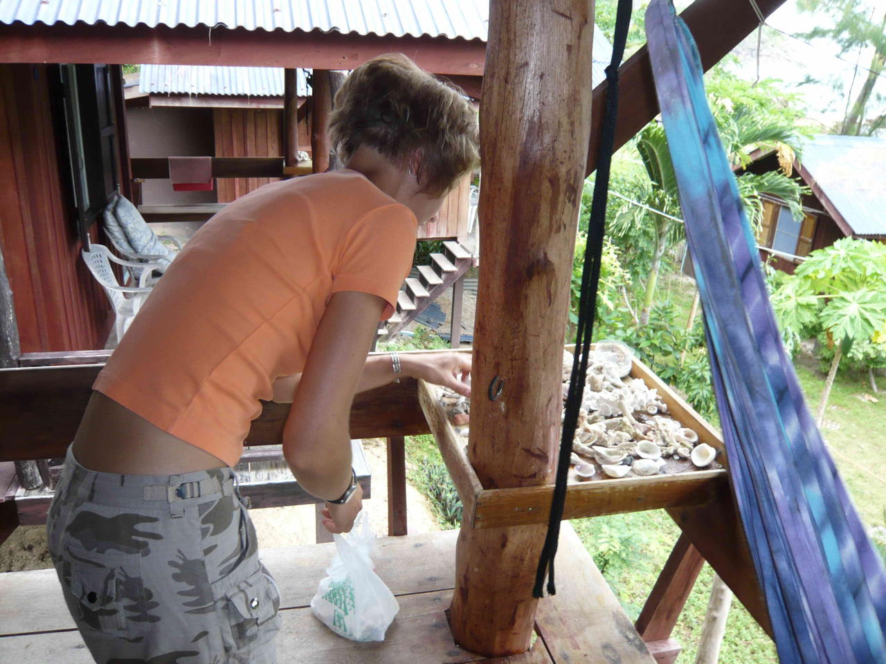 Es regnete ein paar mal ganz kraeftig, sogar ein Pickup-Fahrer hatte Mitleid und wollte uns mitnehmen, aber da es nicht mehr weit fuer uns war, bedankten wir uns nur hoeflich und gingen weiter an der Strasse entlang zurueck, zu der Stelle wo uns das Taxi abgesetzt hatte. Da waren einige kleine Geschaefte. Daniel kaufte Schnorchel + Taucherbrille + eine Unterwasserkamera. Am Strand sind wir zurueck zum Guest-House. Trockene Sachen anziehen und ein kleiner Spaziergang am Strand entlang zur winzig kleinen vorgelagerten Halbinsel. Wobei ich ja sagte, dass das eine Insel ist, bei Flut. *g*