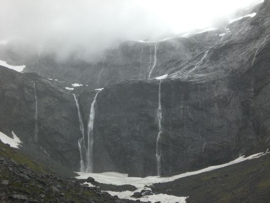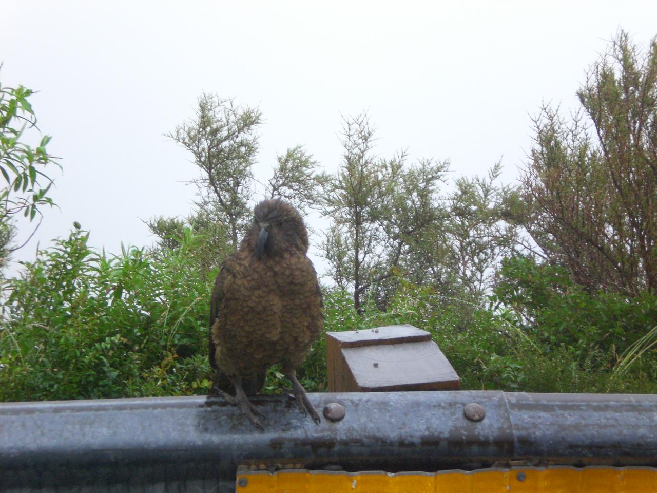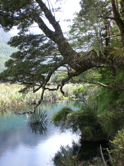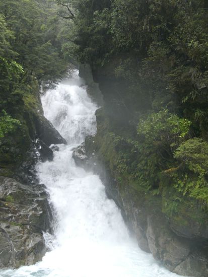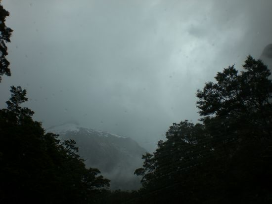 Die Fahrt führt erst ohne Regen durch unveränderte Gebirgsregionen, vorbei an den Mirror Lakes...die Berge spiegeln sich hier bei gutem Wetter in den Seen, bevor der 1200 m lange Homer Tunnel durchfahren wird, der sich in eine mit Regenwald bedeckte Schlucht öffnet, die zum Milford Sound führt. Aus dem Tunnel heraus landen wir mitten in den Wolken. Es regnet jetzt und wir werden direkt von Keas dort begruesst.
